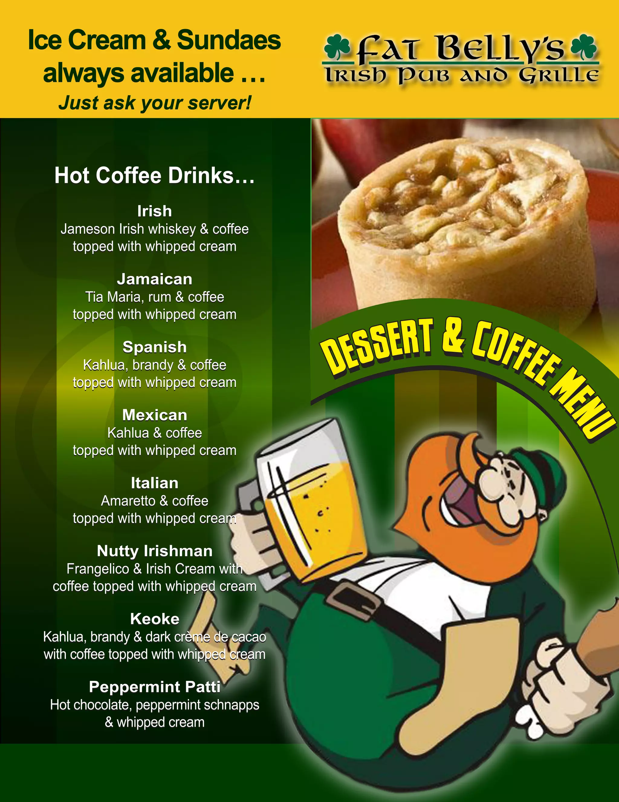 The document provides descriptions of various hot coffee drink options that can be ordered. The drinks combine coffee with liquors like Irish whiskey, rum, brandy, and liqueurs such as Kahlua, Tia Maria, Amaretto, and Frangelico. Most are topped with whipped cream. Locations associated with the drinks include Irish, Jamaican, Spanish, Mexican, and Italian. There are also non-alcoholic options like hot chocolate.