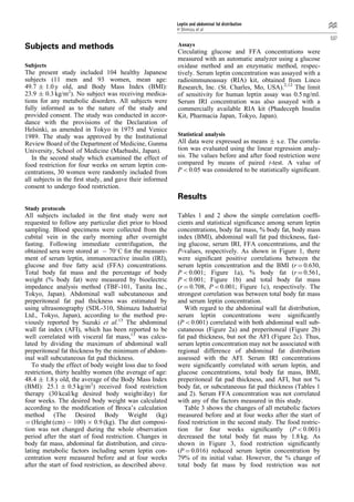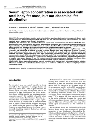 This study investigates the relationship between serum leptin concentrations and body fat parameters in 104 healthy Japanese subjects. Results show that serum leptin is significantly correlated with total body fat mass, body fat percentage, and BMI, but not with abdominal fat distribution. A four-week food restriction reduced both serum leptin levels and body fat mass, although the percentage change in leptin did not correlate with the change in body fat.