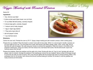 The document contains a variety of vegetarian recipes, including options for veggie meatloaf, chili, pasta, salads, fajitas, and more. Each recipe provides a list of ingredients along with detailed cooking instructions. These healthy dishes cater to different meal preferences, serving several people and offering a range of flavors and ingredients.