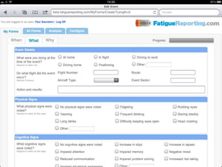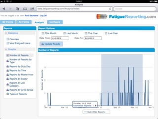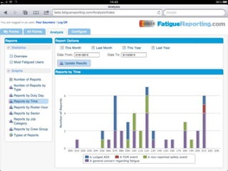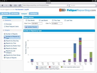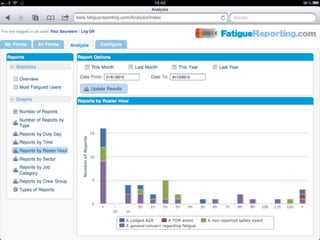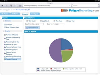 The document describes a Fatigue Risk Management System that is available online through any internet browser. It has a clean, simple interface to display information for effective and quick analysis. The system uses intuitive wizards, attractive UI elements, and progress feedback to guide users through simple forms, security controls, and data analysis tools. It can be customized to an organization's branding needs and integrated with other systems.