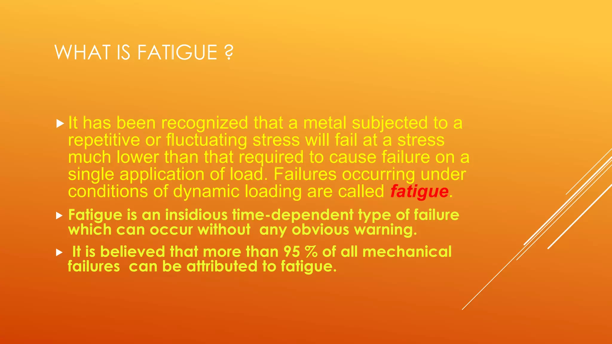 Fatigue testing involves subjecting materials to repetitive loads or stresses to determine their fatigue life. There are two main types of fatigue testing: constant amplitude testing, where the stress level remains constant for each cycle, and variable amplitude testing, where the stress level varies each cycle. Fatigue testing can be done on standardized test specimens or actual components. Common machines used include rotating beam machines, where a stationary load bends a rotating specimen, creating repeated stresses. The results of fatigue testing are often displayed using an S-N curve to show the relationship between stress levels and the number of cycles before failure.
