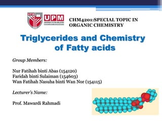 This document provides information about fatty acids and triglycerides. It discusses the structure, properties, and reactions of fatty acids, including their length, degree of saturation, and location of double bonds. Triglycerides are introduced as esters composed of glycerol and three fatty acid chains. Their physical properties depend on the fatty acid components, and they undergo hydrolysis, saponification, and hydrogenation reactions. The learning outcomes are to understand fatty acids and triglycerides, and distinguish between their physical and chemical properties.