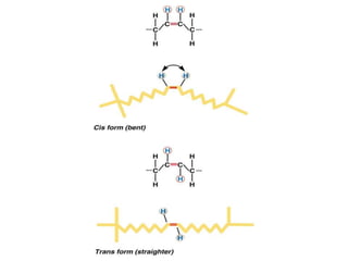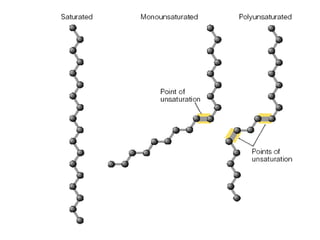 This document discusses fatty acids, which are carboxylic acids and key building blocks for lipids. Fatty acids can be saturated or unsaturated depending on whether they contain single or double carbon bonds. They are classified based on chain length and the number and position of double bonds. Unsaturated fatty acids have lower melting points than saturated fatty acids. Essential fatty acids like omega-3 and omega-6 must be obtained through diet as the human body cannot synthesize them. Fatty acids play important structural and physiological roles.