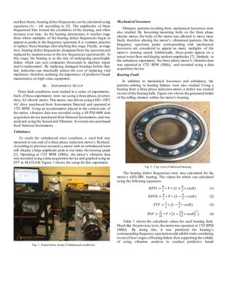 This document discusses using vibration analysis to detect faults and predict failures in rotating equipment like electric motors. It describes an experiment where vibration data was collected from a motor under normal operation and different fault conditions (unbalance, mechanical looseness, bearing defect). The data was analyzed using spectrum analysis software and MATLAB. Specific fault frequencies were identified that corresponded to the type of fault. The results support using vibration analysis to monitor equipment condition and enable predictive maintenance by detecting issues before catastrophic failures occur.