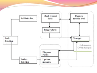 This document presents a fault management mechanism for wireless sensor networks. It discusses fault detection and diagnosis through self-detection by sensor nodes and active detection by cell managers. It also discusses fault recovery through waking sleeping nodes, moving mobile nodes, or selecting a secondary cell manager. The document then describes the network and fault models, and presents an algorithm for faulty sensor detection based on sensor measurements and designating sensor statuses as good, low quality, faulty, or good detected.