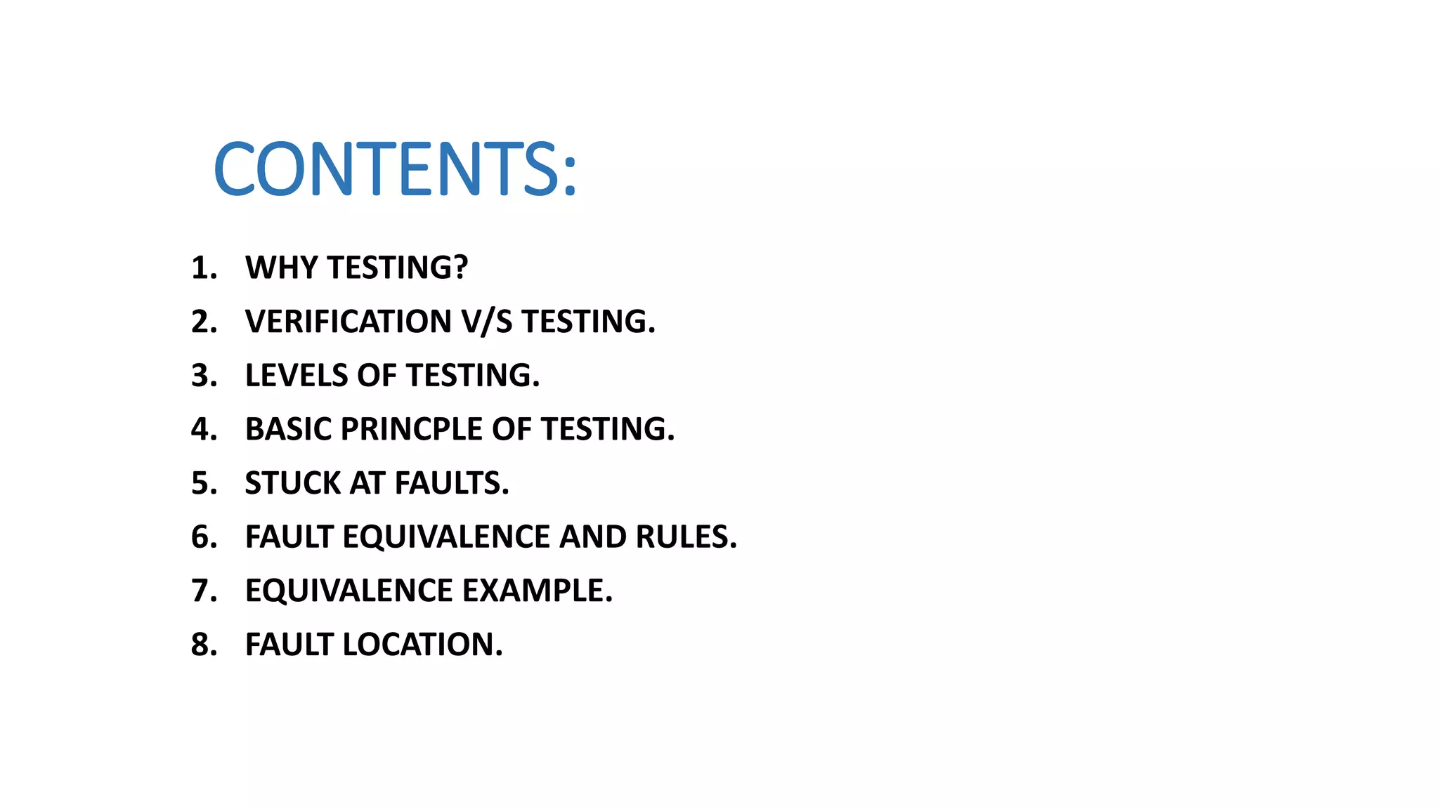 This document discusses fault testing for circuits. It covers why testing is done, different levels of testing from chip to system, and the basic principles of testing using a comparator. It also describes stuck-at faults, the concept of fault equivalence and rules, and provides an example. Finally, it discusses fault location and how a complete location test can distinguish faults but two faults may become functionally equivalent in the presence of an undetectable fault.