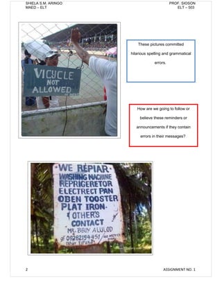 The document discusses spelling and grammatical errors found in signs and announcements in the Philippines. It shows pictures of signs with errors in spelling, tense, and redundant words. The author notes that these errors can prevent the intended message from being understood and believes they should be fixed. While humorous at first, these errors demonstrate the importance of proofreading to ensure clear communication.
