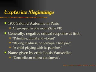 The document summarizes the Fauvist art movement that emerged in 1905 in Paris. The Fauvists, nicknamed "Les Fauves" or "wild beasts", shocked viewers with their explosive use of bright, unnatural colors and visible brushstrokes that broke from traditional techniques. Key Fauvist artists mentioned include Matisse, Derain, and Vlaminck. While initially criticized, Fauvism previewed characteristics of later avant-garde movements and influenced artists' use of color to convey emotions, though the movement was brief and its members soon moved on to other styles.