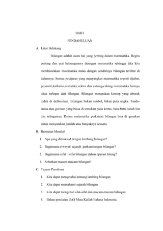 Makalah ini membahas konsep bilangan dalam matematika, termasuk pengertian, sejarah, dan sifat-sifat bilangan dalam operasi hitung. Bilangan dianggap penting karena merupakan bagian dasar dari berbagai cabang matematika dan memiliki simbol-simbol tertentu untuk perwakilannya. Tujuan penulisan meliputi pemahaman mengenai lambang bilangan, sejarahnya, serta berbagai jenis dan sifat-sifat yang terkait dengan bilangan.
