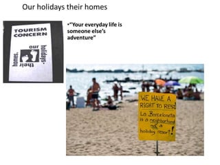 This document discusses using tourism to improve places for both residents and visitors. It outlines the history of sustainable development and defines responsible tourism. Responsible tourism aims to minimize negative impacts, benefit local communities, and involve local people. For tourism to be successful, it must offer unique experiences, maintain cultural heritage and environments, and create a sense of place. However, mass tourism can degrade destinations and lower the quality of life for residents, leading to overtourism. For tourism's benefits to be realized, it must support local employment, facilities, and ownership while limiting leaks from the local economy. The experiences visitors seek are often found through interactions with local people and culture rather than large-scale development. Communities must decide how to develop in