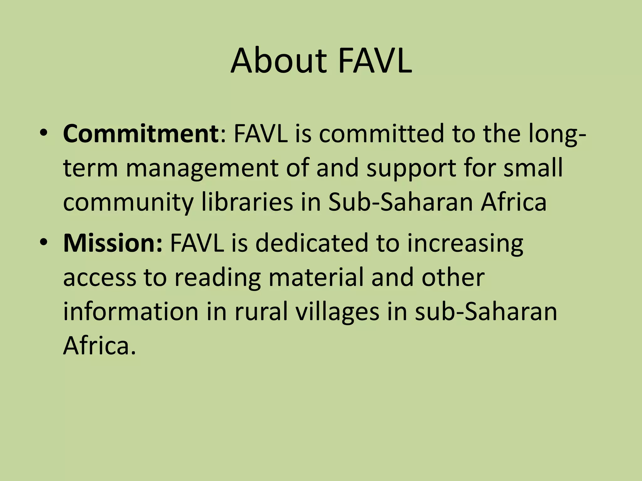 FAVL is committed to establishing and supporting small community libraries in Sub-Saharan Africa to increase access to reading materials. It works with villages to build and staff libraries, provides books and training, and ensures reporting. FAVL has established 14 libraries across 4 countries and supports the Uganda Community Library Association with over 60 member libraries. In 2009-2010, FAVL launched reading camps, opened 4 new libraries in Burkina Faso, received a grant to improve girl access, and increased UgCLA membership by 50%. It also supported various library conferences and launched a study abroad program where students publish culturally relevant books.