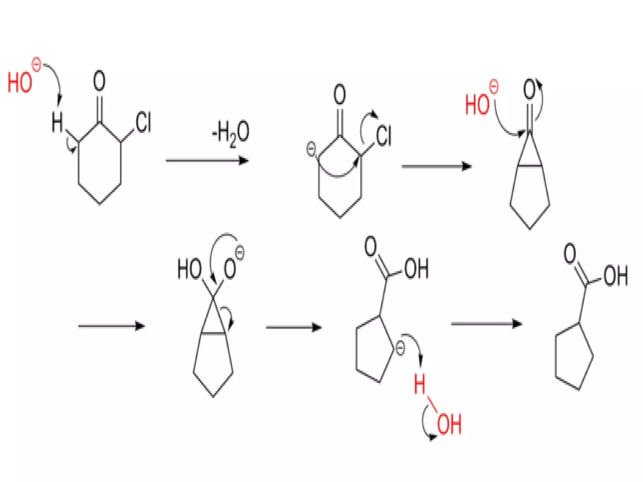The Favorskii rearrangement is a rearrangement of cyclopropanones and α-halo ketones that leads to carboxylic acids or their derivatives. It involves the formation of an enolate away from the halogen that cyclizes to a cyclopropanone intermediate, which is then attacked by a nucleophile like hydroxide or an alkoxide base to yield an acid, ester, or amide through ring contraction. The reaction is useful for preparing carboxylic acids, esters, and amides.