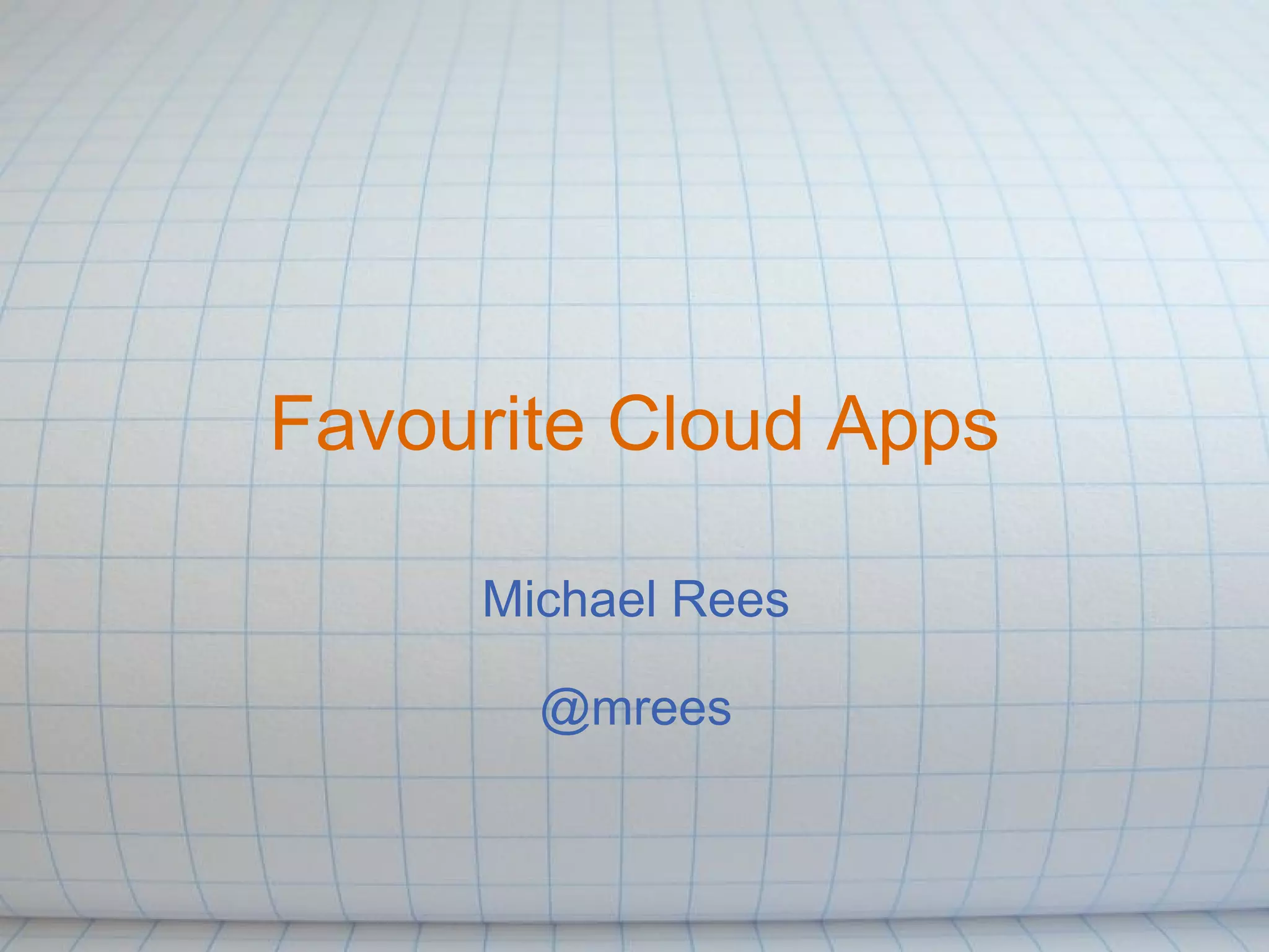 The document discusses various cloud applications recommended by Michael Rees, including Google Docs for online office needs, Slideshare and Prezi for presentations, and Evernote for note-taking. It also covers online storage solutions like Live Mesh, Skydrive, and S3 for data management. Additionally, it mentions Poll Everywhere for real-time polling and voting, highlighting the efficiency and accessibility of these tools.