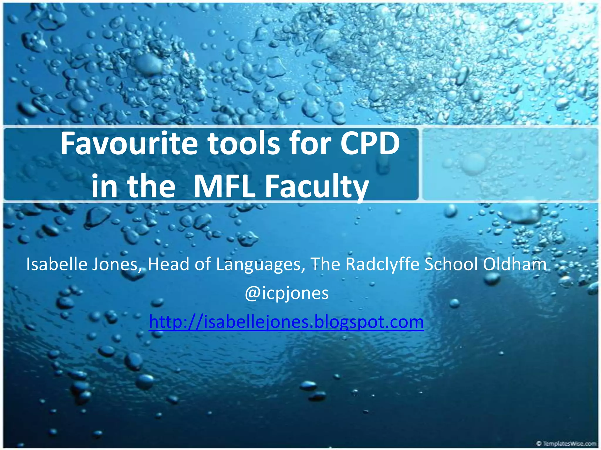 This document discusses various online tools that can be used for continuing professional development (CPD) in foreign language faculties. It describes tools like Delicious, Diigo, and Flickr that allow sharing bookmarks, documents, and photos. It also mentions Ning for setting up larger faculty networks, Slideshare for sharing presentations, Scribd for documents, and Vodpod for embedding videos. The document advocates using these tools to connect with others, widen professional networks, and encourage CPD through sharing resources and networking online. It also briefly discusses the potential of Twitter and future possibilities like teachmeets and Skype surgeries for networking.