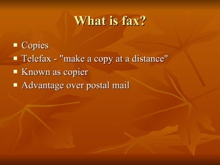 Fax machines allow for documents to be electronically transmitted over telephone lines, providing a faster alternative to postal mail. The idea for fax technology was conceived in 1843, but the first fax machine was not created until 1861 by Giovanni Caselli. Throughout the 20th century, fax machines became smaller, faster, and added color capabilities. Modern fax machines use optical scanning and laser printing to quickly send documents electronically in a variety of paper sizes.