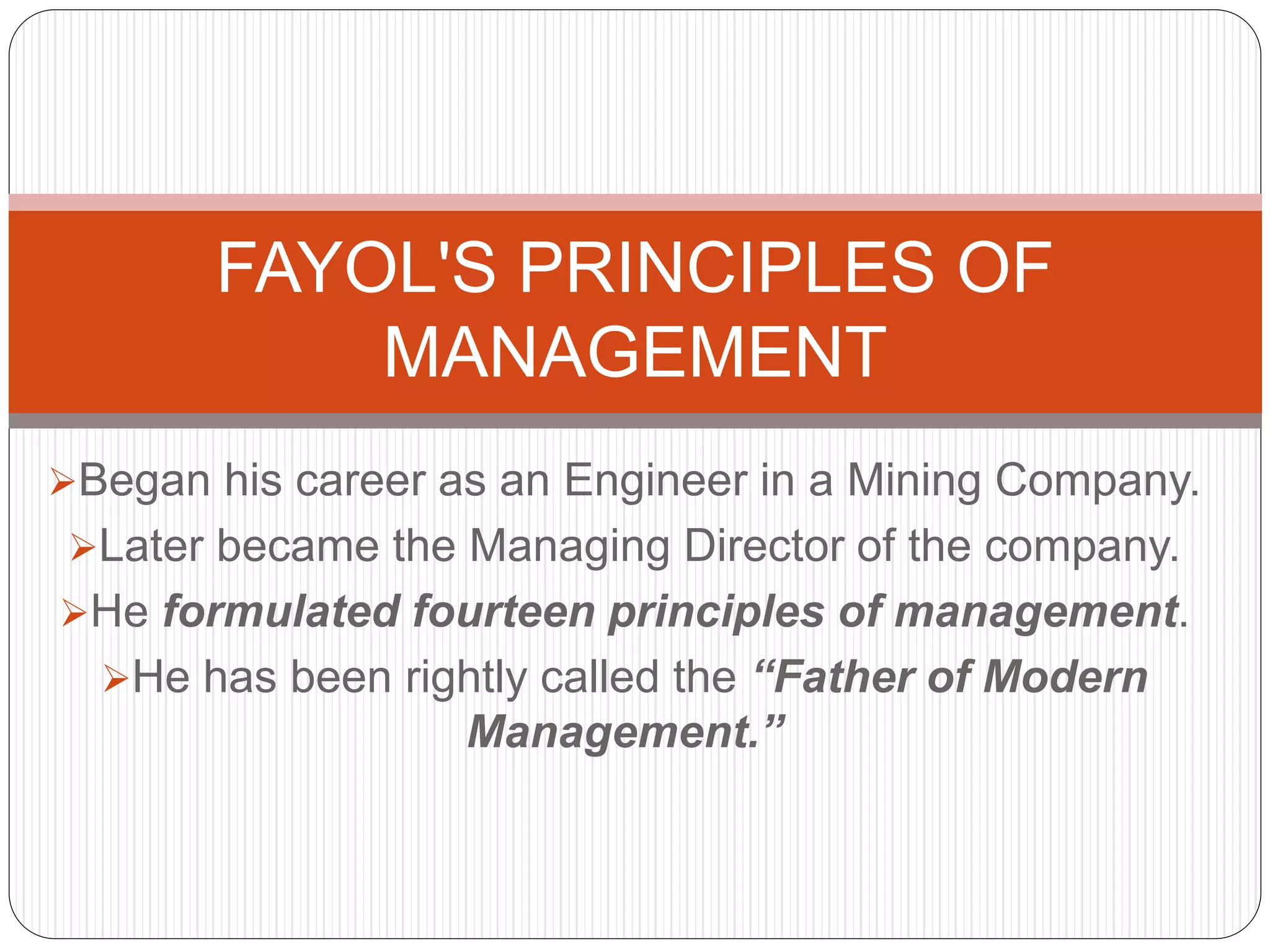 The document discusses Henri Fayol's principles of management. Fayol began his career as an engineer in a mining company and later became the managing director. He formulated fourteen principles of management and is considered the "Father of Modern Management." The principles include division of work, authority and responsibility, discipline, unity of command, unity of direction, subordination of individual interests to general interests, remuneration of personnel, centralization and decentralization, scalar chain, order, equity, stability of tenure of personnel, initiative, and esprit de corps.