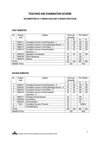 This document outlines the curriculum for a 3-year B.Sc. degree program in Hospitality and Hotel Administration with a specialization in Food and Beverage Management offered jointly by the National Council for Hotel Management and Catering Technology (NCHM&CT) and the Indira Gandhi National Open University (IGNOU) from 2009-2012. The program consists of 6 semesters with theory and practical components. Coursework covers topics like food production, food and beverage service, front office operations, accommodation operations, food and beverage management, and hospitality-related subjects from IGNOU. Practical training is also included. The document provides the semester-wise course breakdown, syllabi for sample courses, and
