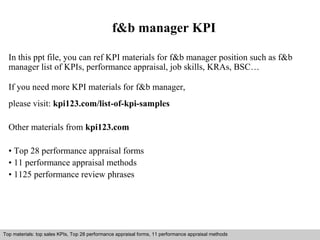 This document discusses key performance indicators (KPIs) for food and beverage managers. It provides examples of KPIs, steps for creating KPIs, common mistakes to avoid, and how to design effective KPIs. The document recommends visiting an external website for additional KPI samples and materials on performance appraisal forms, methods, and review phrases.