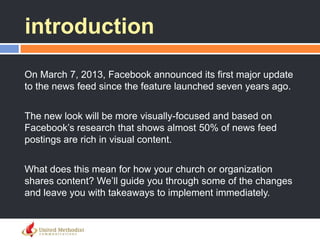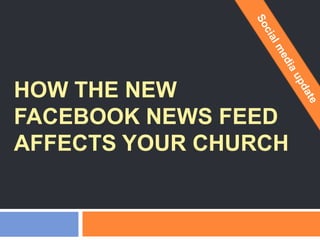 The document discusses how a church's Facebook strategy should adapt to changes in Facebook's news feed. The key changes are that the news feed will now emphasize rich visual content like photos and videos over plain text. It provides 8 tips for churches, including publishing more visual content, identifying evangelists to share posts, making compelling content, and using features like check-ins. The overall message is that churches need to create more engaging visual content to be visible in the new visually-focused Facebook news feed.