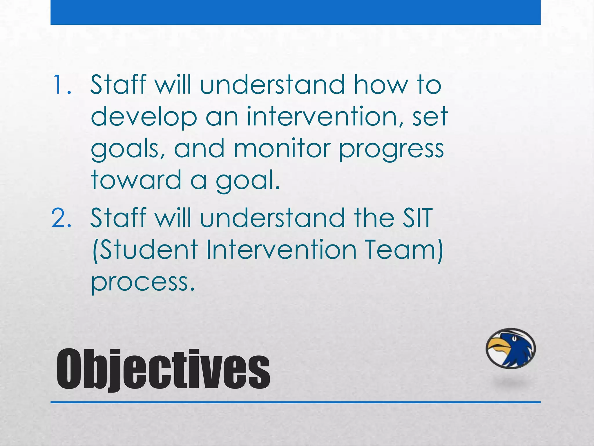 1. Staff will learn how to develop interventions to help struggling students, set goals for student progress, and monitor student progress toward goals.