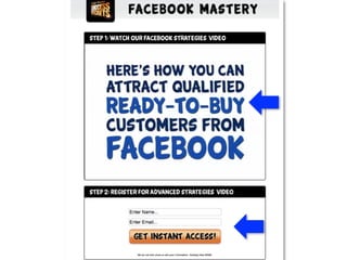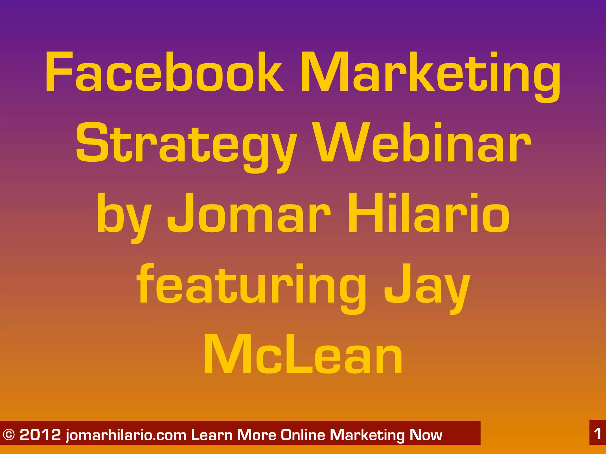 This document summarizes a Facebook marketing webinar presented by Jomar Hilario featuring Jay McLean on June 4, 2012. The webinar focused on 15 Facebook strategies to grow and attract ongoing customers, including the 3 R's of Facebook success: results, report, and role model. Jay McLean has experience using Facebook and other social media to help entrepreneurs find more customers and shares tips like creating a results page, sharing video reports and meetings, and offering a members area to share benefits and value.
