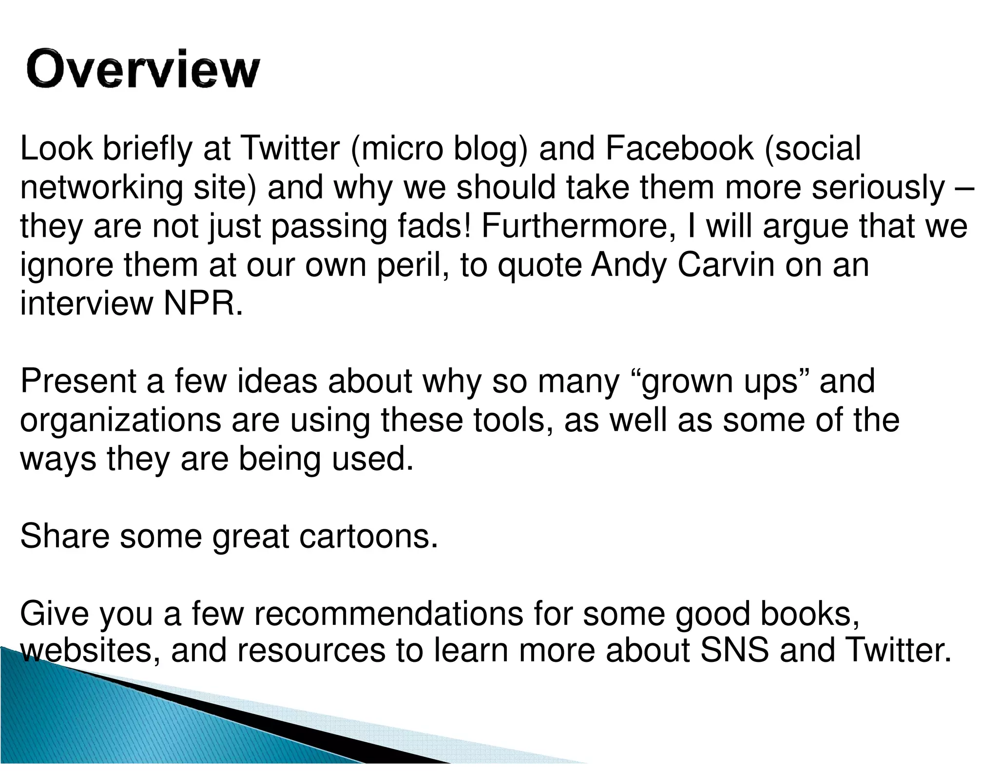 ![Fb Twitter Presentation Cd April19 [Compatibility Mode]](https://image.slidesharecdn.com/fbtwitterpresentationcdapril19compatibilitymode-090419174947-phpapp01/75/Fb-Twitter-Presentation-Cd-April19-Compatibility-Mode-2-2048.jpg)