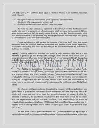The document discusses reliability and validity in qualitative research. It begins by explaining quantitative research and how reliability and validity are defined and ensured in quantitative methods. It then explores how reliability and validity are approached differently in qualitative research since the goals of qualitative research are understanding rather than generalization. Specifically: