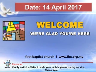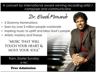 - On April 16th, the speaker will be Dr. Enoch Fernando and the Lord's Supper will be served.