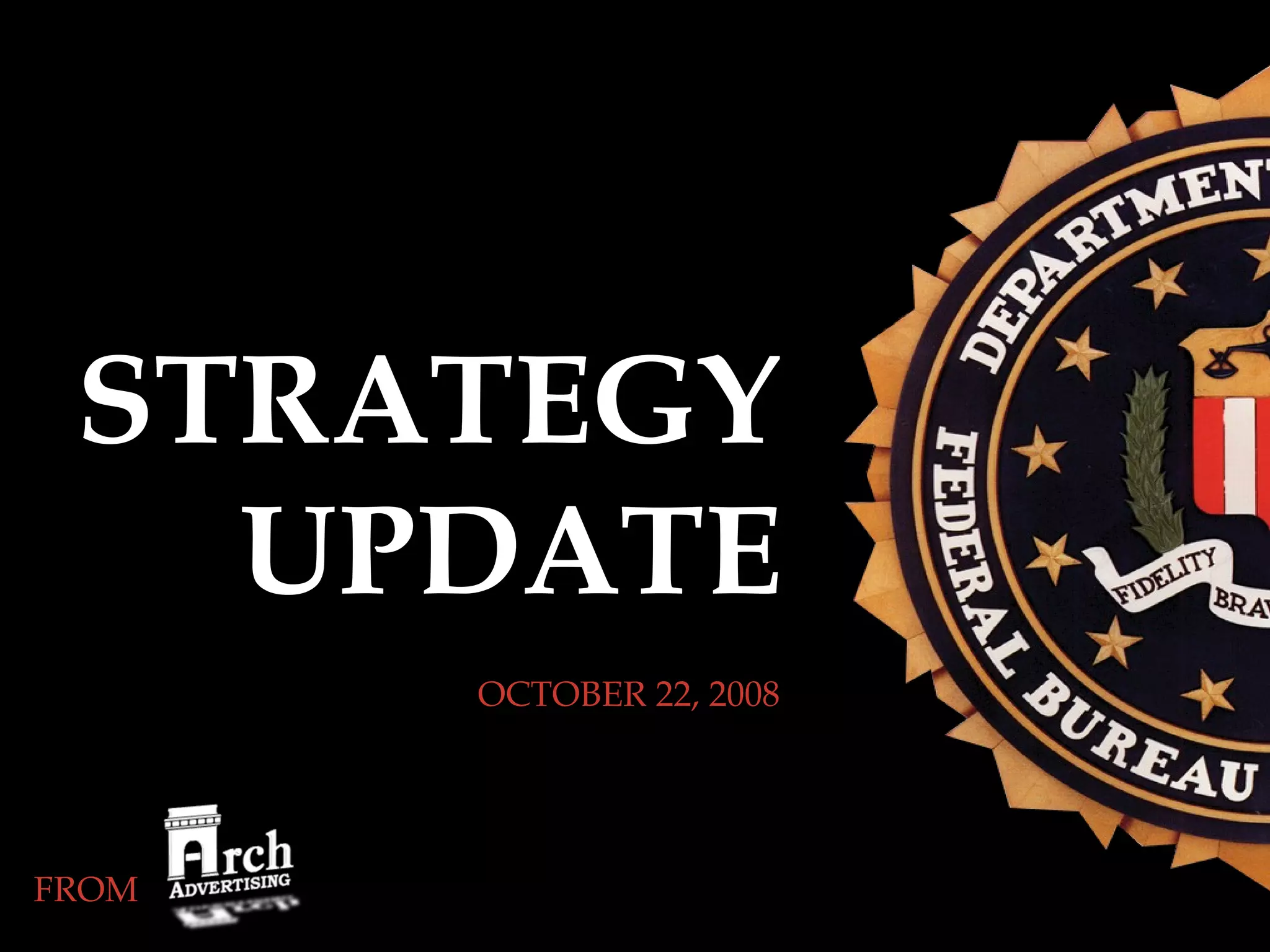 The document outlines an FBI marketing strategy update. It discusses objectives to increase awareness of career opportunities through targeted advertising. Research found most young people are unaware of FBI jobs. The strategy will advertise on campuses and online to reach students and recent graduates. It allocates budgets and outlines plans for creative content, media placement, and public relations activities like press releases, informational sessions, and distribution to publications over several weeks to promote FBI careers.