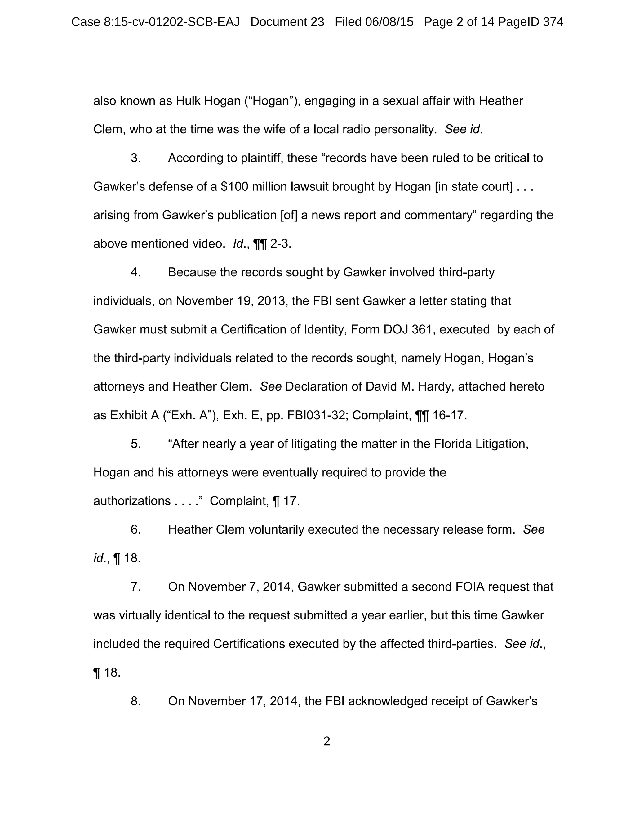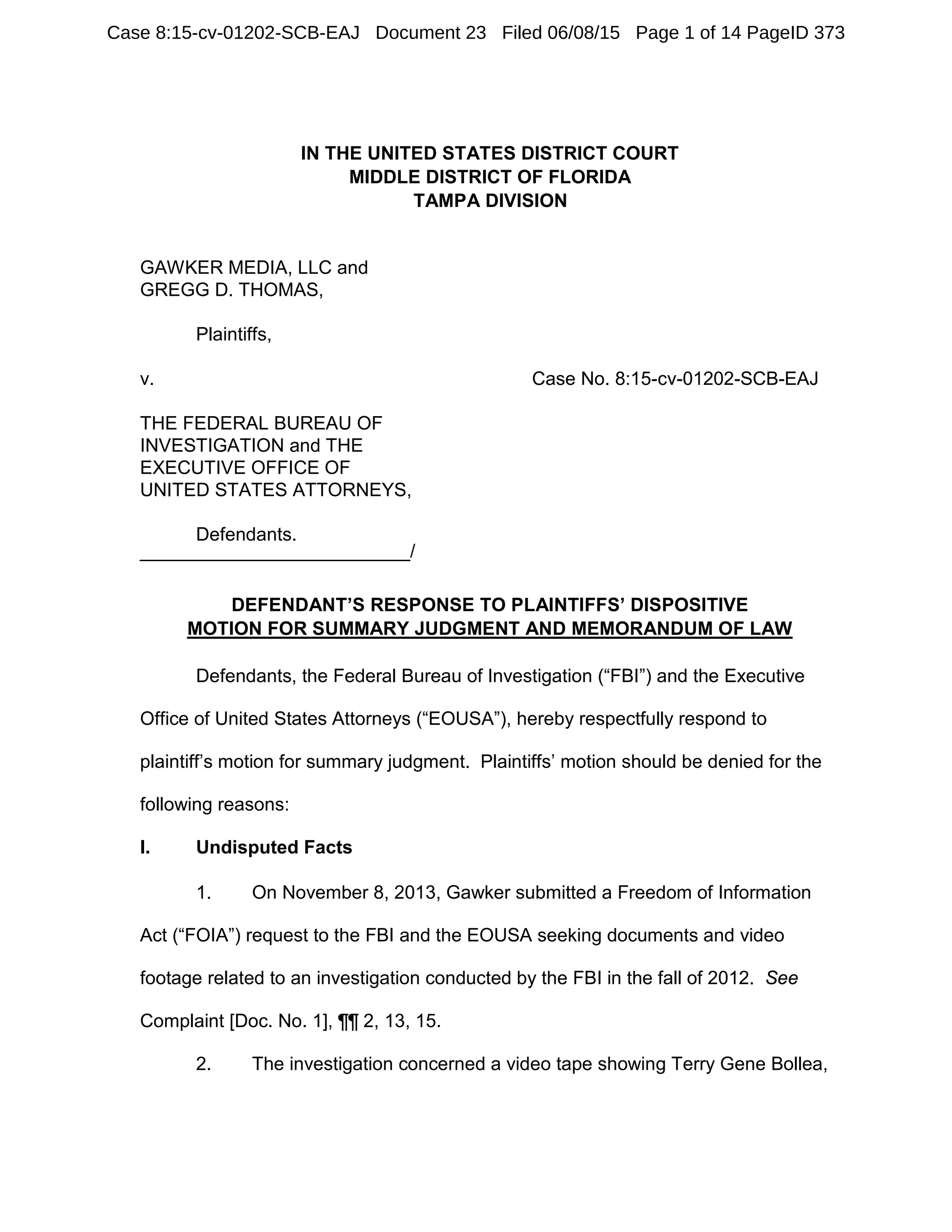 This document is the Defendant's response to the Plaintiff's motion for summary judgment in a FOIA case. It argues that the Plaintiff's motion should be denied for the following reasons: 1) the records sought were compiled for a law enforcement purpose by the FBI; 2) Exemption 7(A) applies because disclosure of the records could reasonably interfere with an ongoing law enforcement investigation by another agency; 3) affidavits submitted by the FBI are presumed to be made in good faith and the FBI's invocation of exemptions is entitled to deference. The response provides undisputed facts and arguments supporting the application of Exemption 7(A) to withhold the requested records.