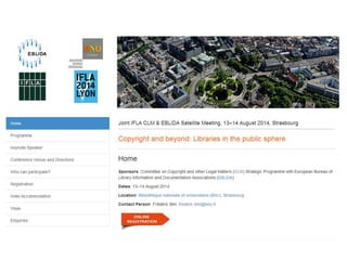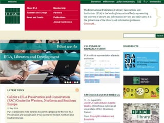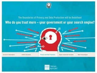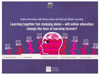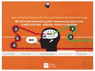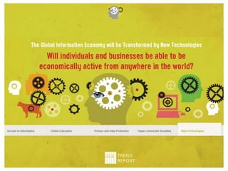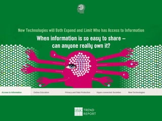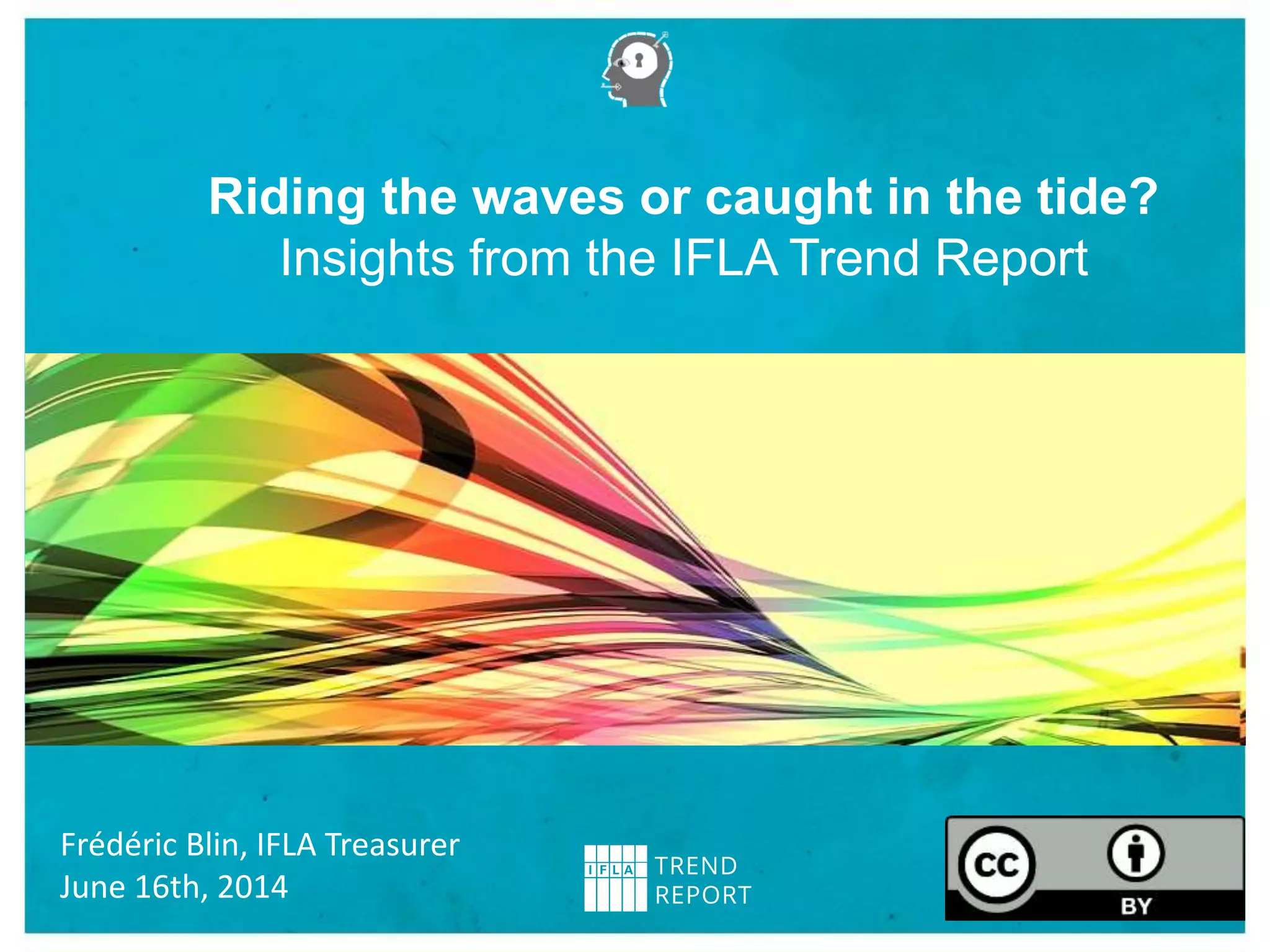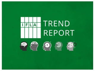 The document summarizes the IFLA Trend Report, which identifies major trends that will impact libraries. It discusses the report's creation through expert contributions and discussions. The report identifies 5 key trends: 1) New technologies will impact access to information; 2) Online education will transform traditional learning; 3) Data privacy boundaries will be redefined; 4) Hyper-connected societies will empower new groups; 5) New technologies will transform the global information economy. The document concludes by encouraging engagement with the ongoing report and discusses IFLA's role in related issues.