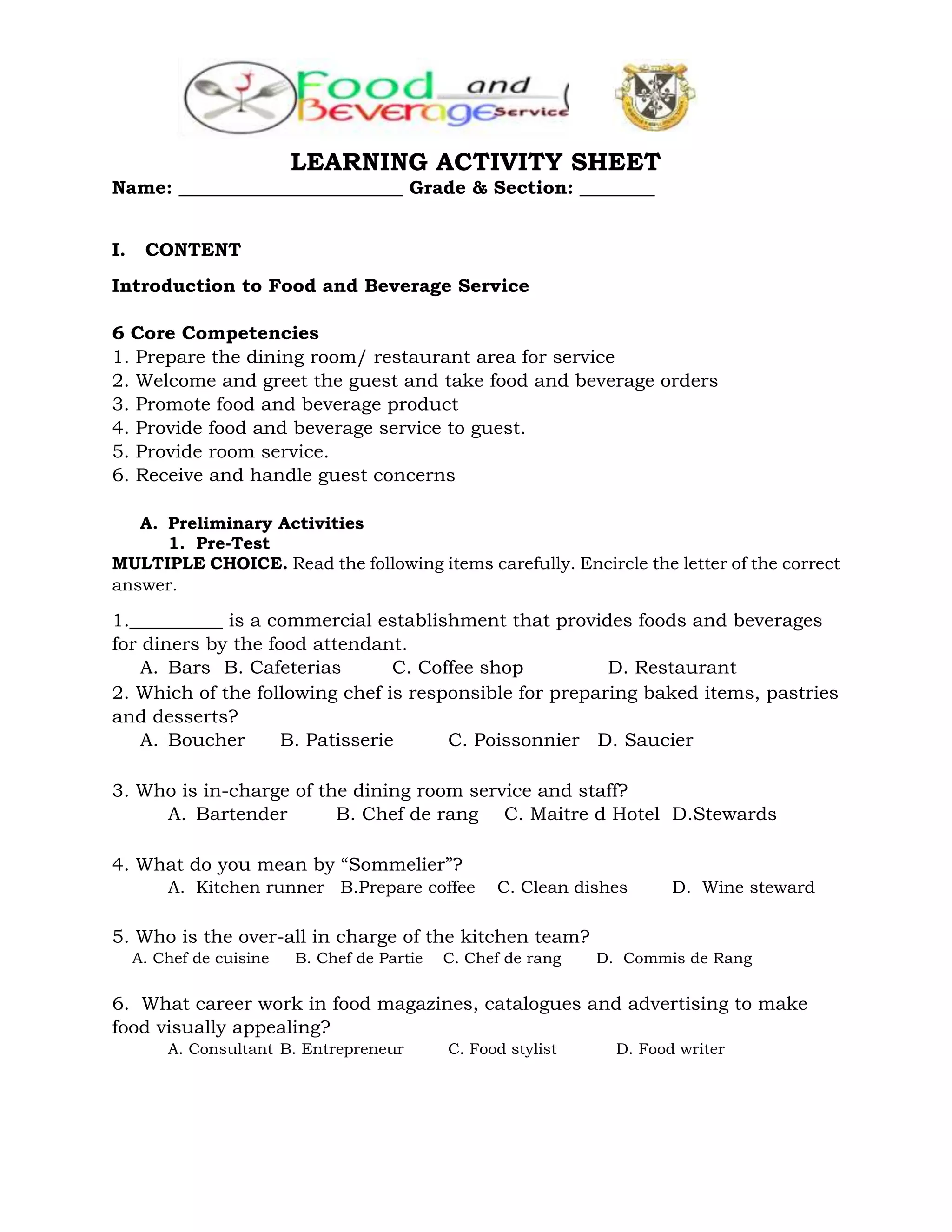 This document is a learning activity sheet for a food and beverage service course. It includes an introduction to the 6 core competencies of food and beverage service, such as preparing the dining area and taking orders. There is a pre-test with multiple choice questions about roles in the restaurant industry. The activity section has students write down what comes to mind for terms like "food", "beverage", and "service". It also has them create a concept map around the word "restaurant". The document emphasizes that customer satisfaction is important for the success of food and beverage businesses.