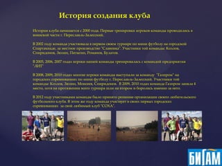 История клуба начинается в 2000 году, с первых тренировок в Переславле-Залесском, а в 2012 году был основан любительский футбольный клуб 'Соха'. Клуб поставил перед собой цели, включая успешное участие в чемпионате города по мини-футболу и развитие социального присутствия, а также привлечение спонсоров для финансирования команды. Основные задачи и расходы клуба на 2013 и 2014 годы включают приобретение формы и тренировки, с суммарными затратами в 205,500 рублей.