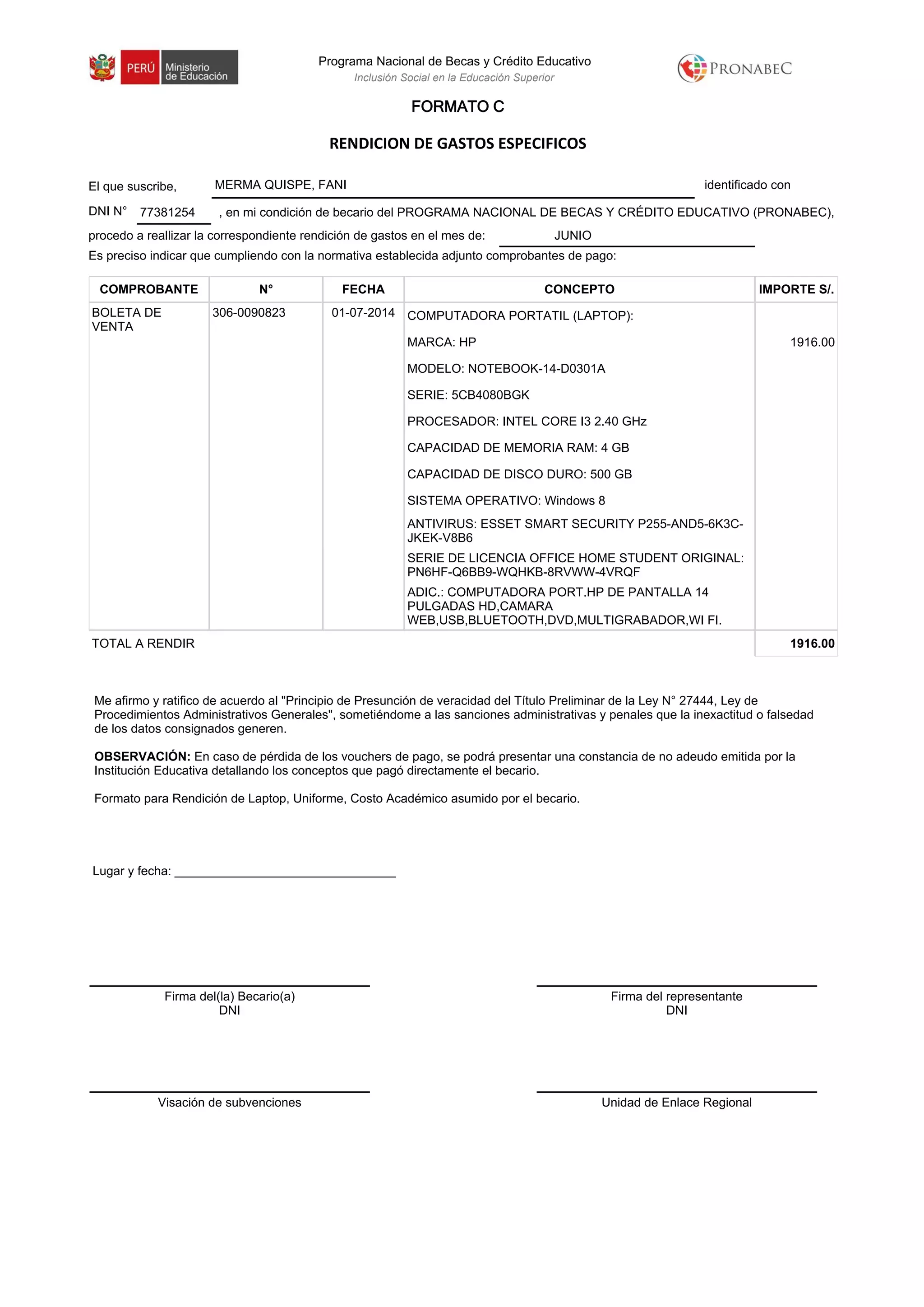 Este documento es una rendición de gastos de un becario del Programa Nacional de Becas y Crédito Educativo (PRONABEC) por el mes de junio. Incluye un comprobante de pago por 1916 soles para la compra de una laptop marca HP con procesador Intel Core i3, 4GB de RAM, 500GB de disco duro, sistema operativo Windows 8 y software antivirus y office original. El becario certifica que los datos son veraces de acuerdo a la ley.