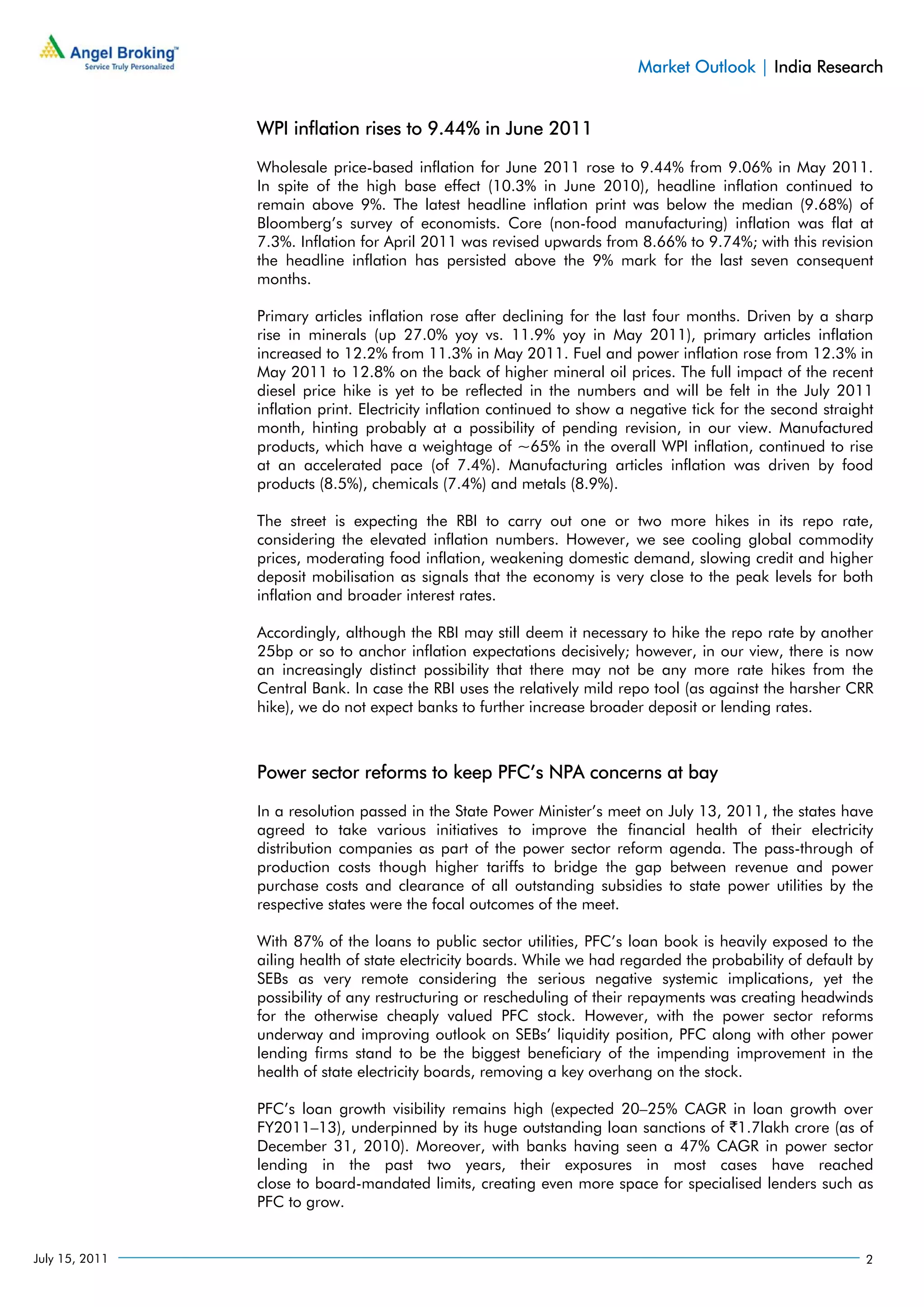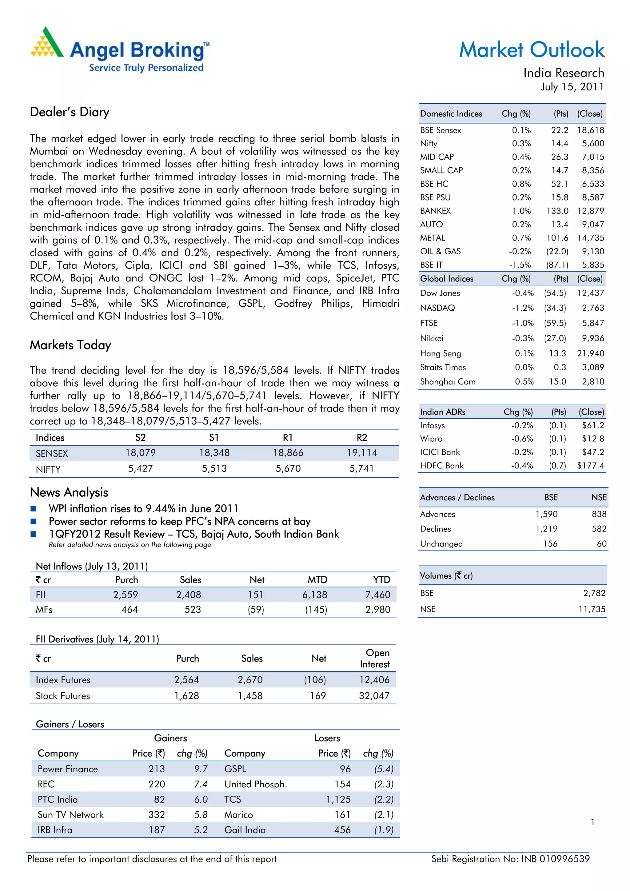 The document summarizes the Indian stock market outlook and performance on July 15, 2011. It reports that domestic indices closed with modest gains of 0.1-0.4%, while global indices declined. Wholesale price inflation in India rose to 9.44% in June 2011, above estimates and persisting above 9% for seven months, driven by increases in primary articles and fuel costs. Key benchmark levels are identified for determining if the market may continue rallying or correct in the near term.