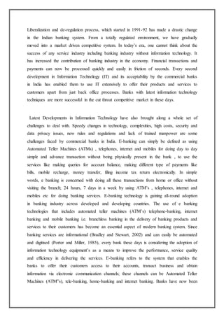This document discusses electronic banking in India. It provides an overview of how liberalization and deregulation in the 1990s changed the Indian banking system and led to increased use of information technology. It defines electronic banking and describes some key technologies used, including automated teller machines, debit cards, credit cards, charge cards, and smart cards. The document discusses the needs and advantages of electronic banking, its impact on traditional banking services, risks involved like operational risk and security risk, and legal/compliance risk.