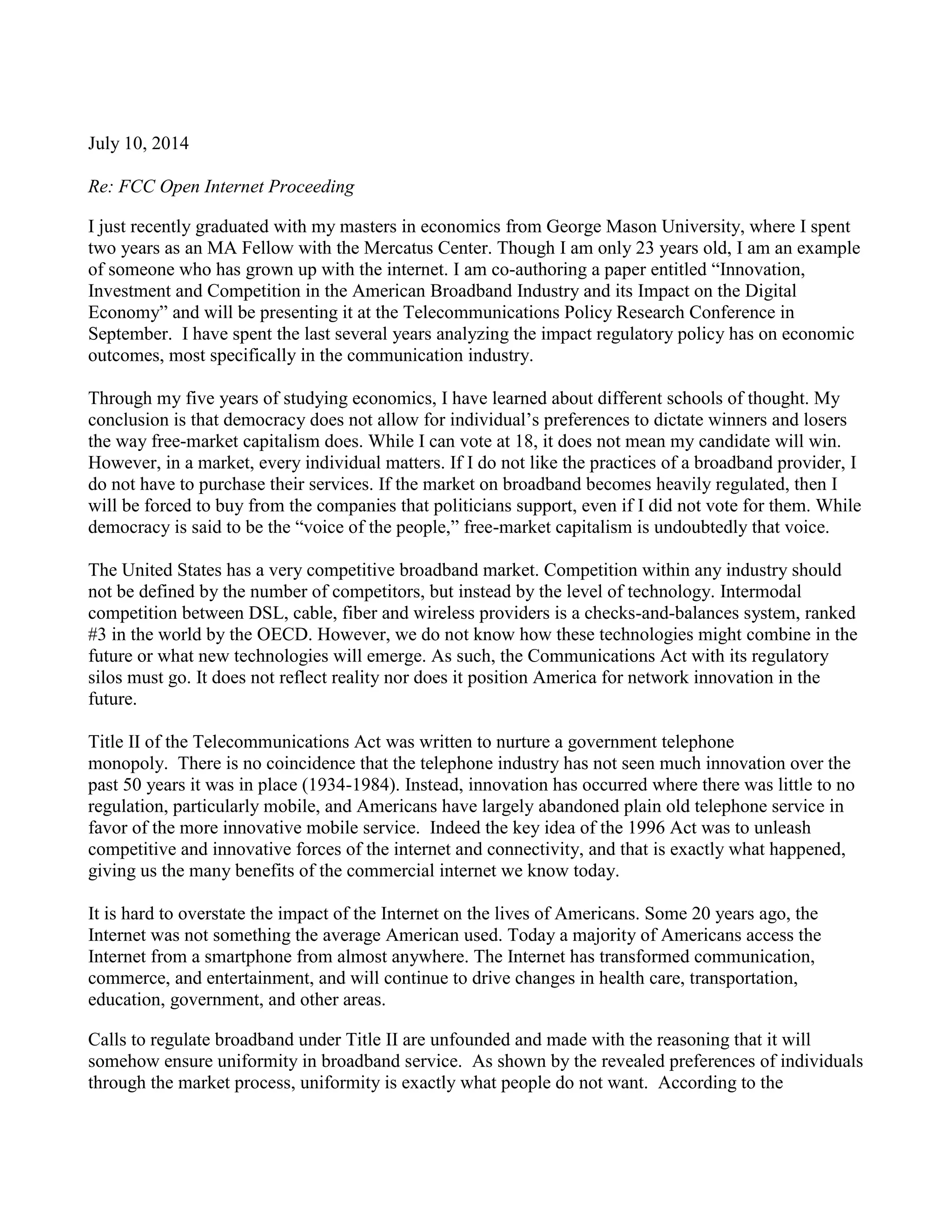 1) The document is a letter from Michael J. Horney, a 23-year-old economics graduate, to the FCC regarding its open internet proceeding.
