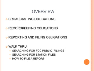 The document outlines FCC regulatory training for broadcasting staff, detailing obligations such as recordkeeping, reporting, and filing requirements. Key broadcasting rules discussed include the personal attack rule, political editorial rule, equal time rule, and contest regulations. Additionally, it provides guidelines for maintaining a public inspection file, including contents related to applications, ownership, EEO requirements, and political files.