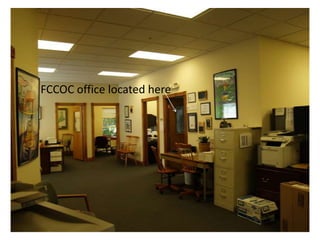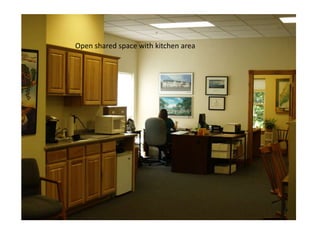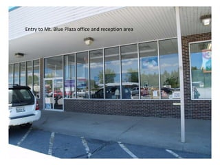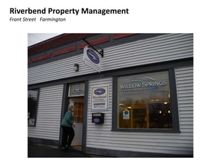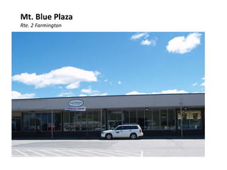 This document compares several office space options for the FCCOC in Farmington, Maine. Riverbend Property Management offers $500/month for a small shared space with no separate office. Front Street Exchange offers $438/month for a 6' x 12' office, small reception area, and meeting room seating 4-6. Walmart offers $600/month and will design the space to suit FCCOC's needs along a busy Route 2 location. Mount Blue Plaza offers utilities included for $600/month along Route 2 with a reception area, office, conference room, kitchen, and storage in an older building.