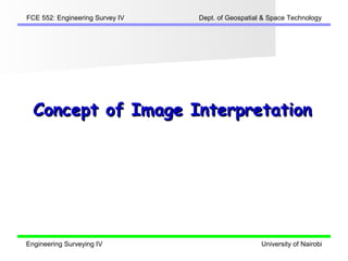 The document discusses image interpretation in engineering surveying. It covers key concepts like the remote sensing process, objectives of image interpretation to extract qualitative and quantitative information, and procedures of interpretation. It also outlines interpretation elements like tone, size, shape, texture, pattern, relationships and keys. Examples of applications discussed include interpreting land covers, floods, wildlife, volcanoes, mines, environments and oceans.