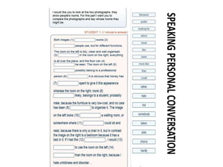 This document discusses an FCE exam for the speaking portion. It focuses on a personal conversation where the examinee must describe two opinions on photographs, one being a landscape and the other being a seaside scene.
