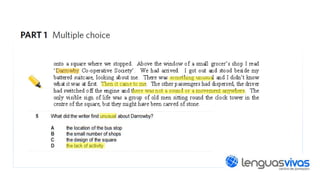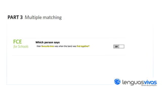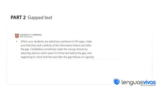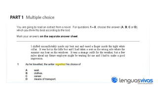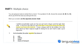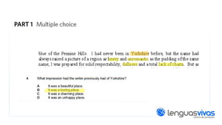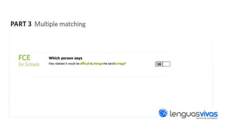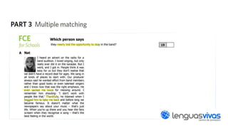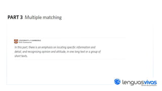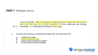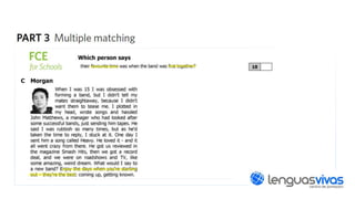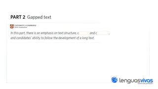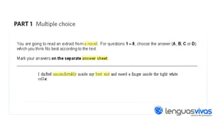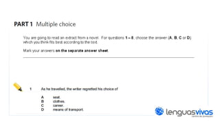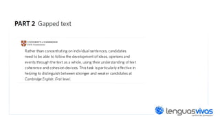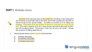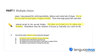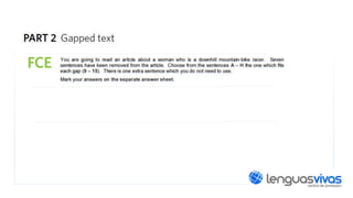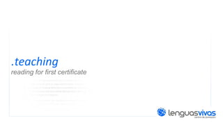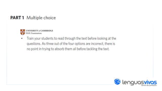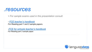 This document provides an overview of strategies for teaching reading for the First Certificate exam. It discusses analyzing texts in parts 1, 2 and 3 and encouraging predictive exercises. Tips are provided like focusing on referents, using memory tricks and having students rephrase questions. The document also addresses encouraging extensive reading, upcoming exam changes and references for further reading.
