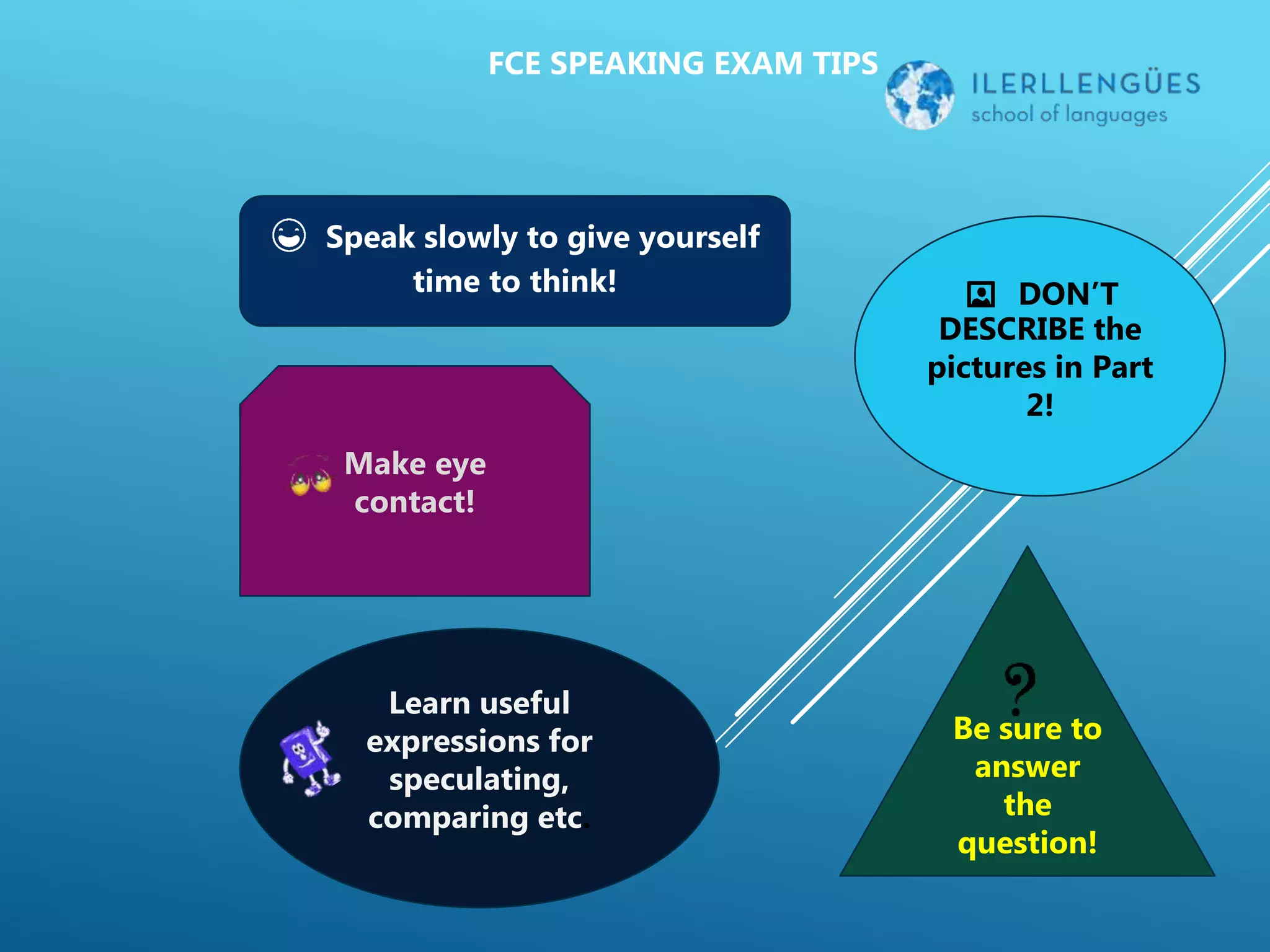 This document provides tips and useful expressions for the FCE Speaking exam. It recommends speaking slowly and making eye contact in Part 1. In Part 2, it advises not describing the pictures but instead using a simple structure to compare and contrast them using expressions like "whereas" and "while." For Part 3/4, it offers phrases for turn-taking, reaching a decision, expressing opinions, and inviting agreement from the other speaker.