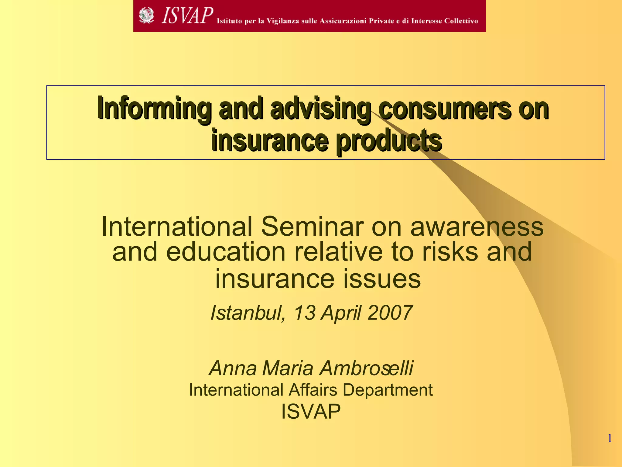 The document discusses ISVAP's initiatives to improve transparency and consumer awareness in life insurance products through regulations such as Circular 551, which mandates clear disclosures and comparisons for potential policyholders. It outlines the responsibilities of insurance companies and intermediaries in providing information and assistance to consumers, ensuring they understand the contract characteristics and associated risks. Additionally, it highlights enhancements to ISVAP's website and the establishment of a register for insurance intermediaries to protect consumer interests.