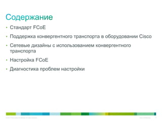 Документ описывает диагностику и настройку конвергентных подключений, включая стандарт FCoE и поддержку конвергентного транспорта на оборудовании Cisco. Он также охватывает ключевые аспекты сетевого дизайна, включая управление QOS и важные настройки для виртуальных и физических интерфейсов. Основное внимание уделяется интеграции технологий Ethernet и Fibre Channel для повышения производительности и надежности сетевых решений.