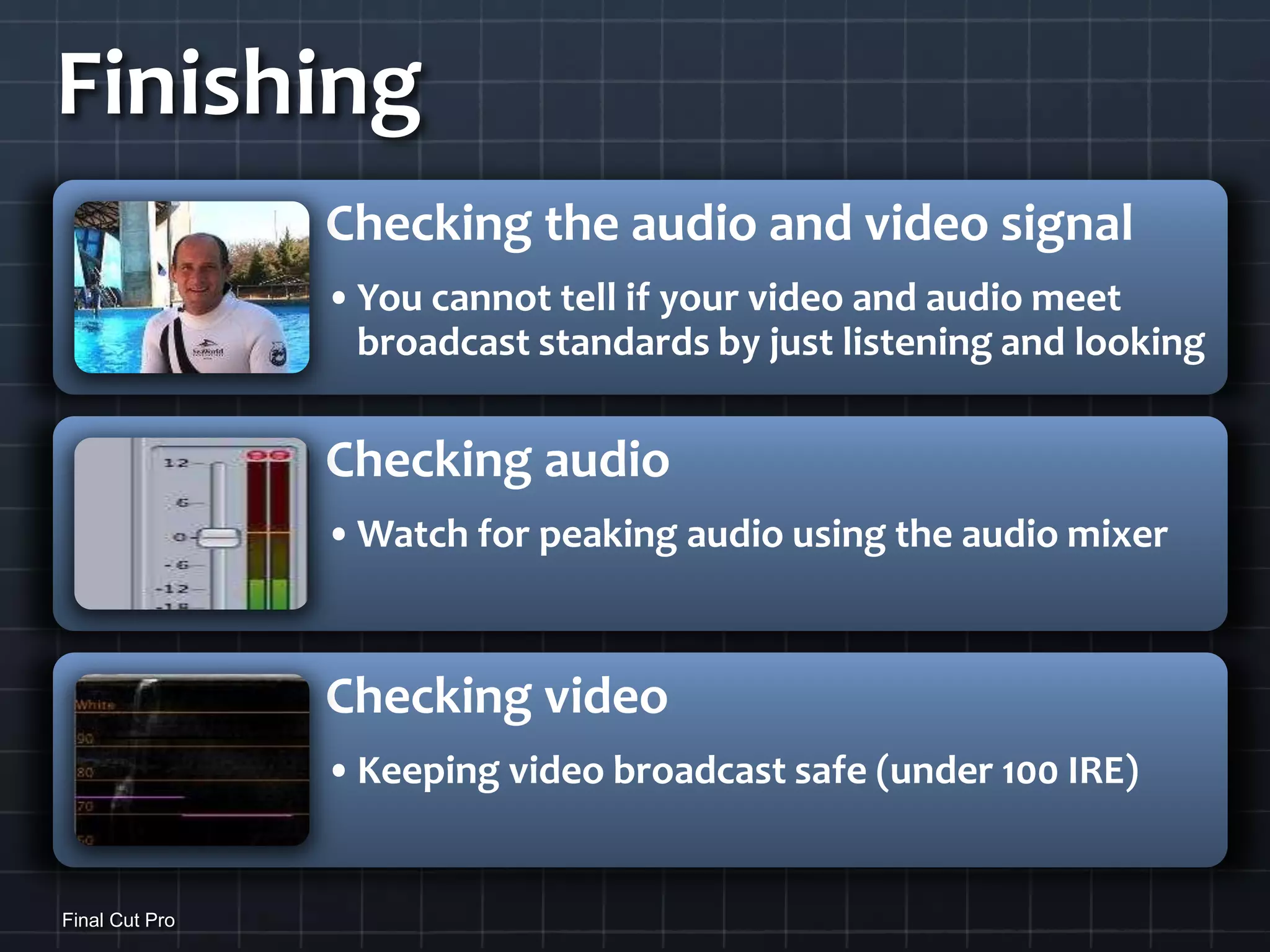 The document provides guidance on finishing and outputting projects in Final Cut Pro, focusing on audio and video finishing techniques. It outlines various export options, including full-quality video exports and web conversions. Additionally, it mentions recording to videotape as a final output method.