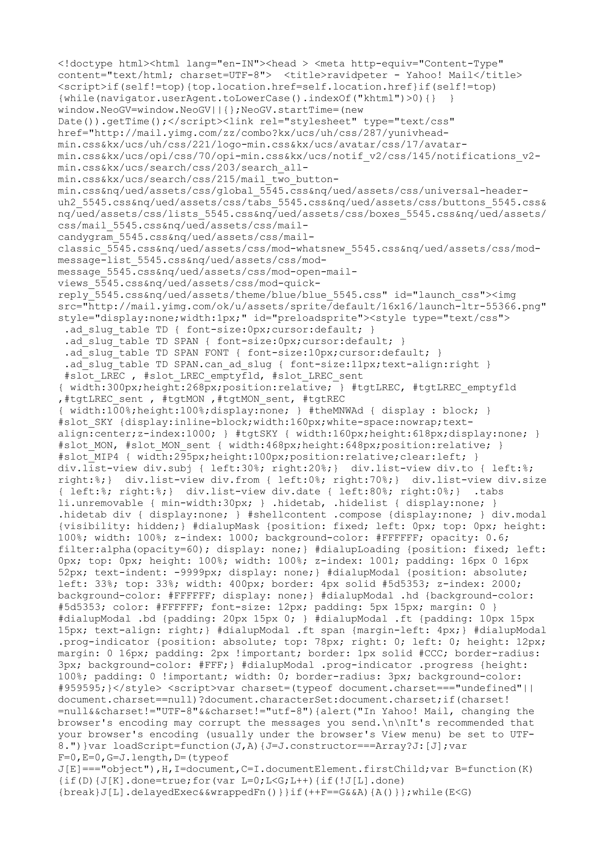 This document is the HTML code for the Yahoo Mail homepage. It includes code for page elements like the header, sidebar, notifications, and different sections of the mail interface. The HTML lays out the structure and styling of the various page components through elements, classes, IDs and linked CSS/JavaScript files.