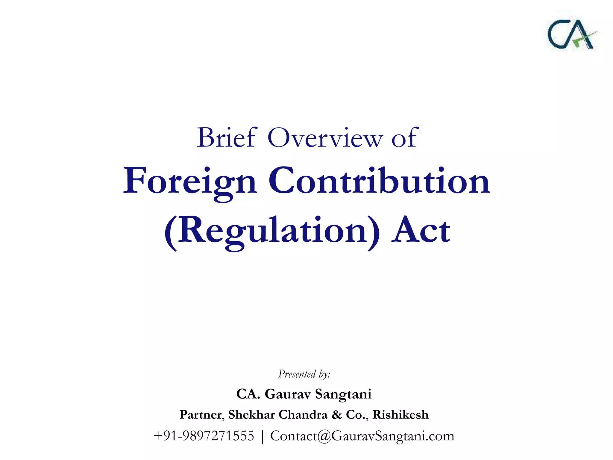 The document provides an overview of the Foreign Contribution (Regulation) Act (FCRA) in India. The key points are:
