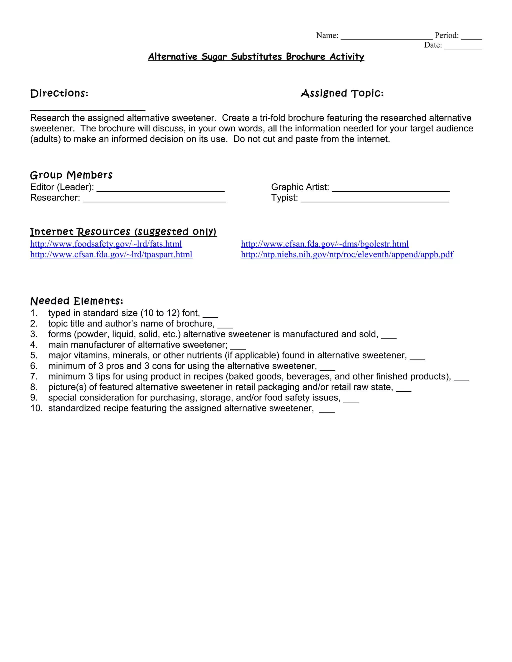This document outlines an assignment for students to research an alternative sugar substitute and create a tri-fold brochure about it. The brochure must include information like the forms in which the substitute is sold, its manufacturer, nutritional content, pros and cons of using it, tips for using it in recipes, pictures, and a sample recipe. It assigns group roles like leader, graphic artist, and researcher. It also provides suggested internet resources for researching the topic.