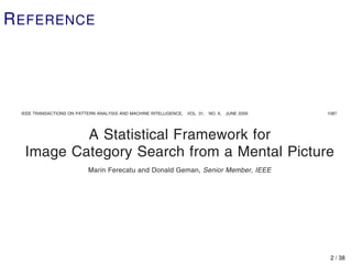 This document describes a statistical framework for interactive image category search based on mental matching. The framework allows a user to search an unstructured image database for a target category that exists only as a "mental picture" by providing feedback on displayed image sets. At each iteration, the system selects images to maximize the information gained from the user's response. The goal is to minimize the number of iterations needed to display an image from the target category. Experiments showed the approach was effective on databases containing tens of thousands of images across several semantic categories.